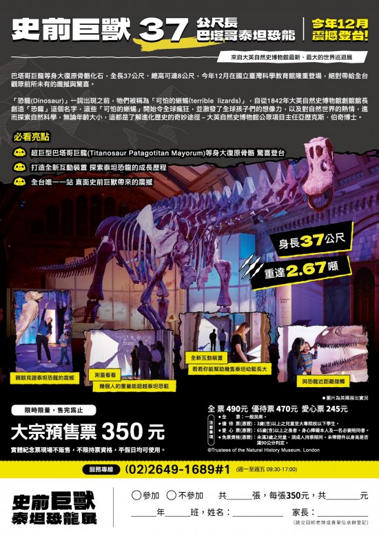 (一) 37公尺長巴塔哥巨龍等身大復原骨骼化石,驚喜登台。觀眾可以親身感受,並在重達2.67噸的巴塔哥巨龍(Patagotitan Mayorum)全身復原骨骼下方觀察,這是迄今為止發現的最完整的巨大恐龍。