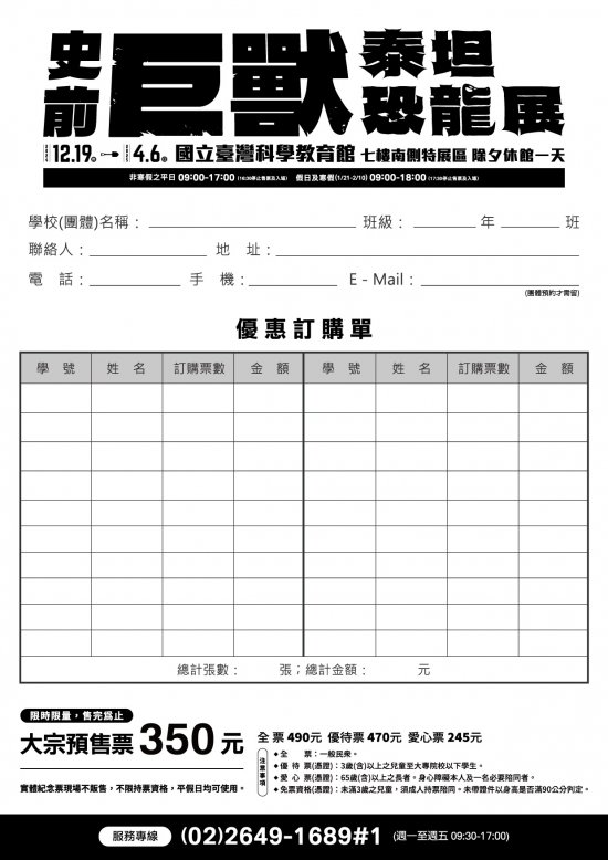 (一) 學校預售票,不分大人、小孩皆為350元,平日、假日均可使用。